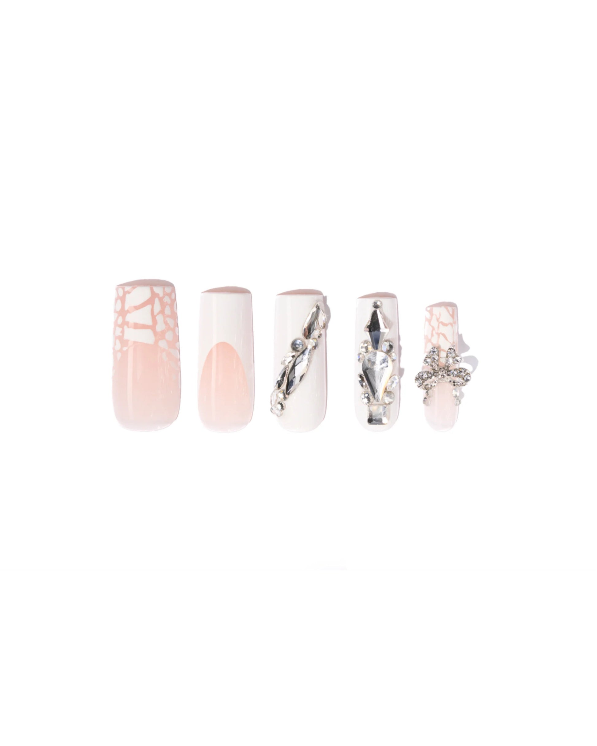 Milk Marie offers a unique Crackle nail effect with bedazzled accent nails for a trendy and eye-catching look. With its square shape, these nails provide a modern and sophisticated touch. Perfect for those looking to make a statement with their manicure.